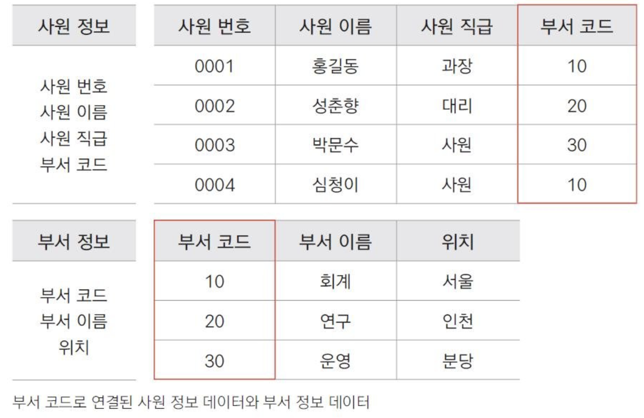 | 테이블 간의 관계를 외래키(foreign key) 등으로 구현하여 사용 |