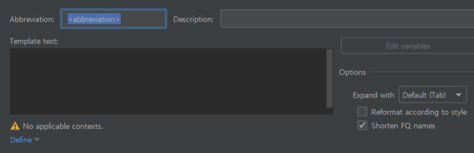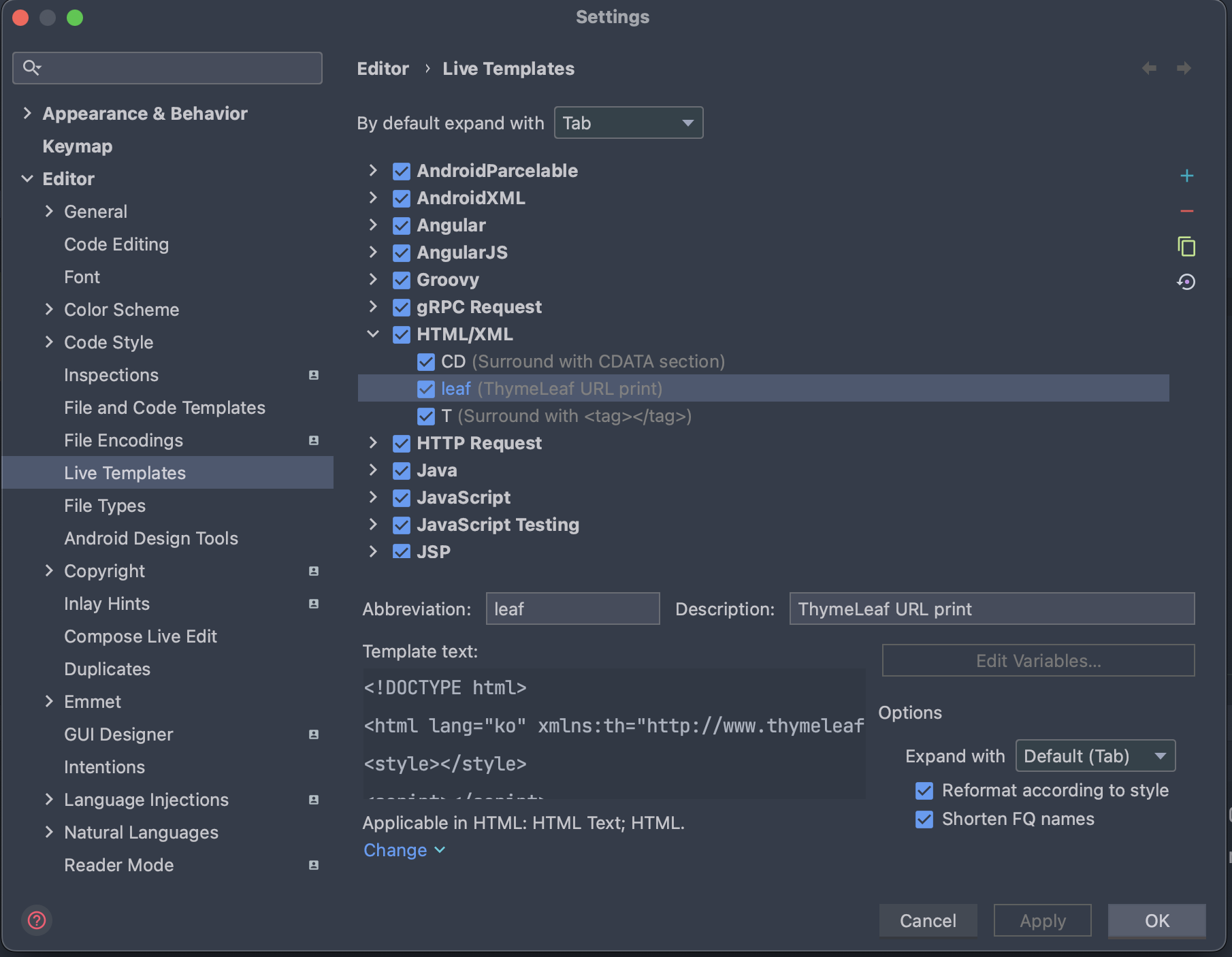 Settings(command + ,)에 들어간 후 live templates를 찾는다.