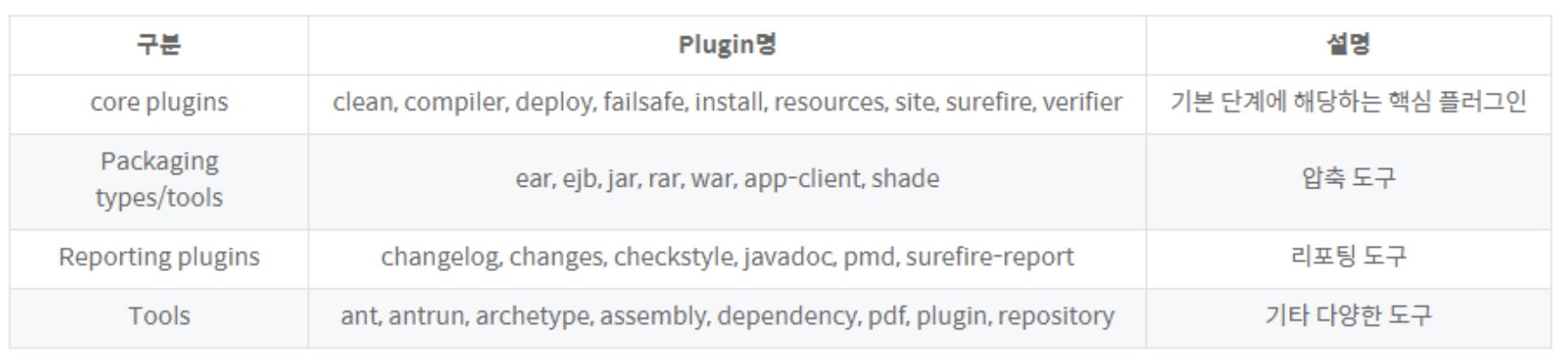 - 메이븐은 대부분의 빌드 작업시 플러그인을 활용