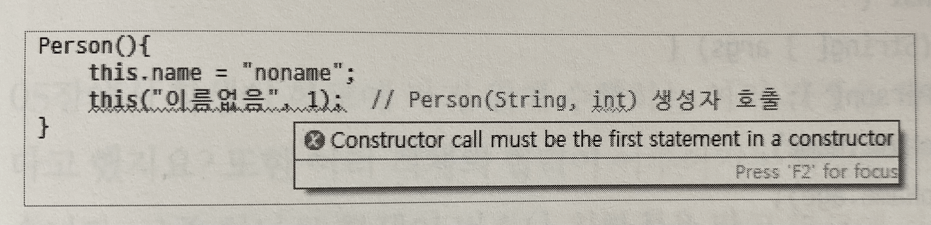 - 다른 생성자 호출시 호출하는 코드 이전에 다른코드 삽입 할 수 없다.