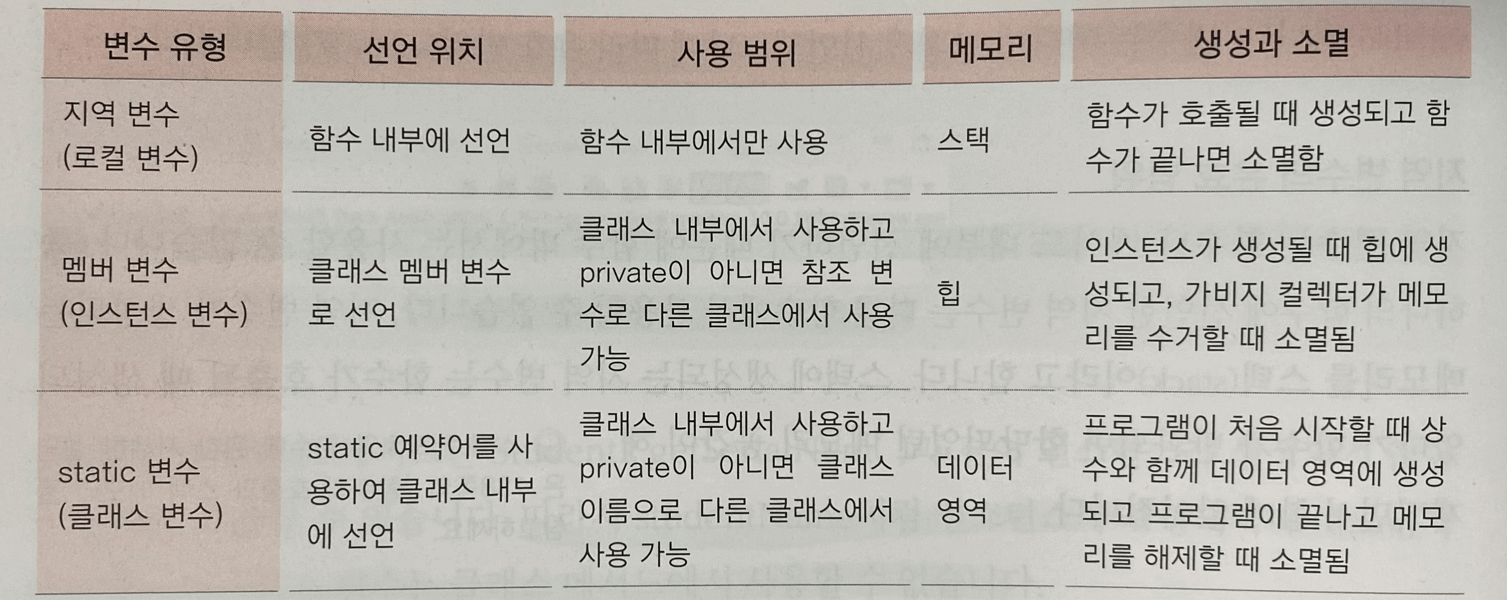 - 지역변수 ( int i ) - 메서드 호출시 생성되고 메서드가 끝나면 사라짐