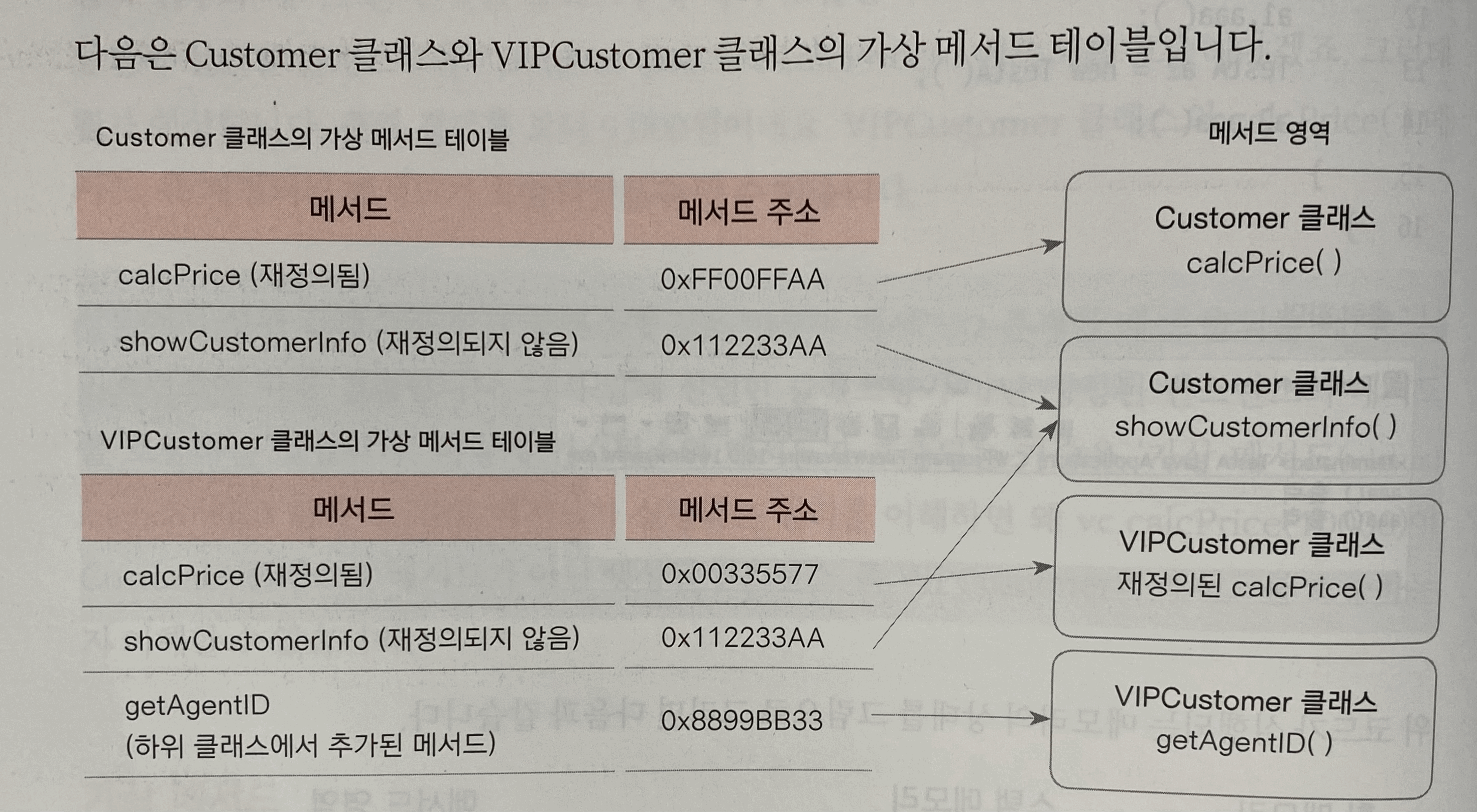 - 가상 메서드 테이블이 만들어지고 각 테이블은 각 메서드 이름과 실제 주소가 짝을 이루어 호출하는 원리