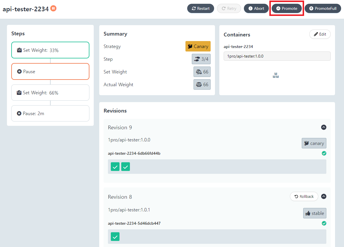 - Step3. Set Weight: 66% : Stable 1 pod, Canary 2 pod 상태로 만듬