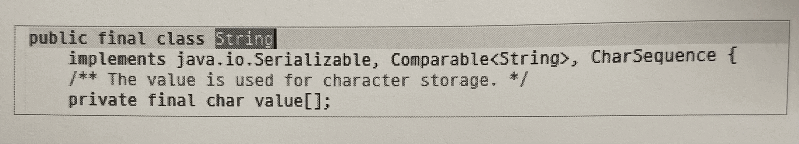 - value 변수는 final로 선언되어 있다. 따라서, 한번 생성된 문자열은 변경되지 않는 불변의 특징을 갖는다.