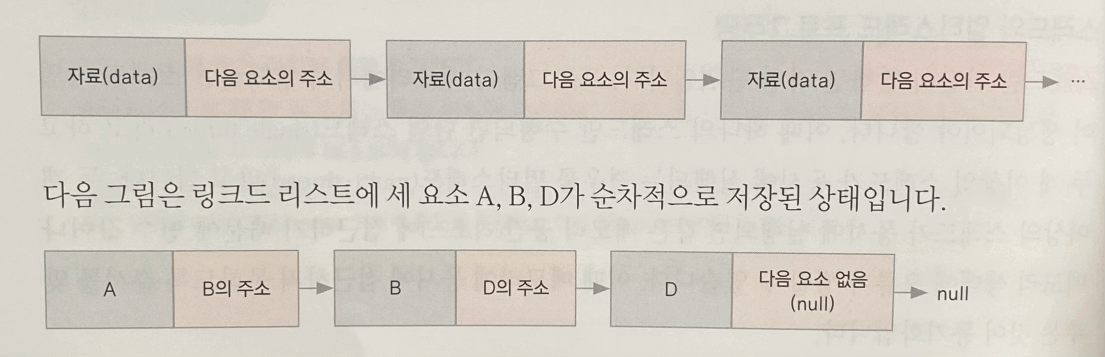 - 링크드 리스트의 각 요소는 다음 요소를 가리키는 주소값을 갖음