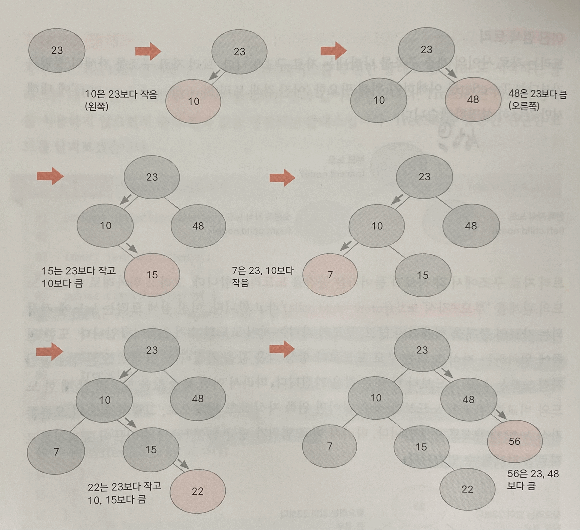 - 맨 왼쪽 노드부터 시작해서 왼쪽 - 부모 - 오른쪽 순으로 순회하면 오름차순