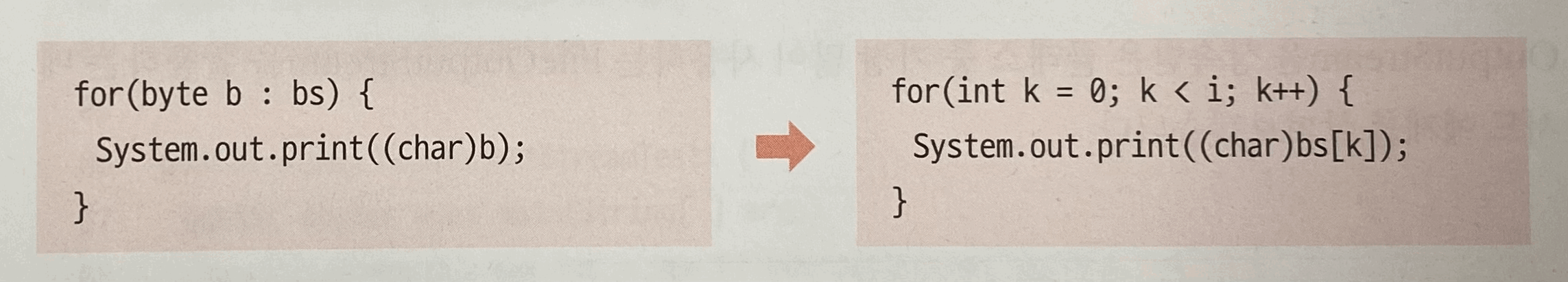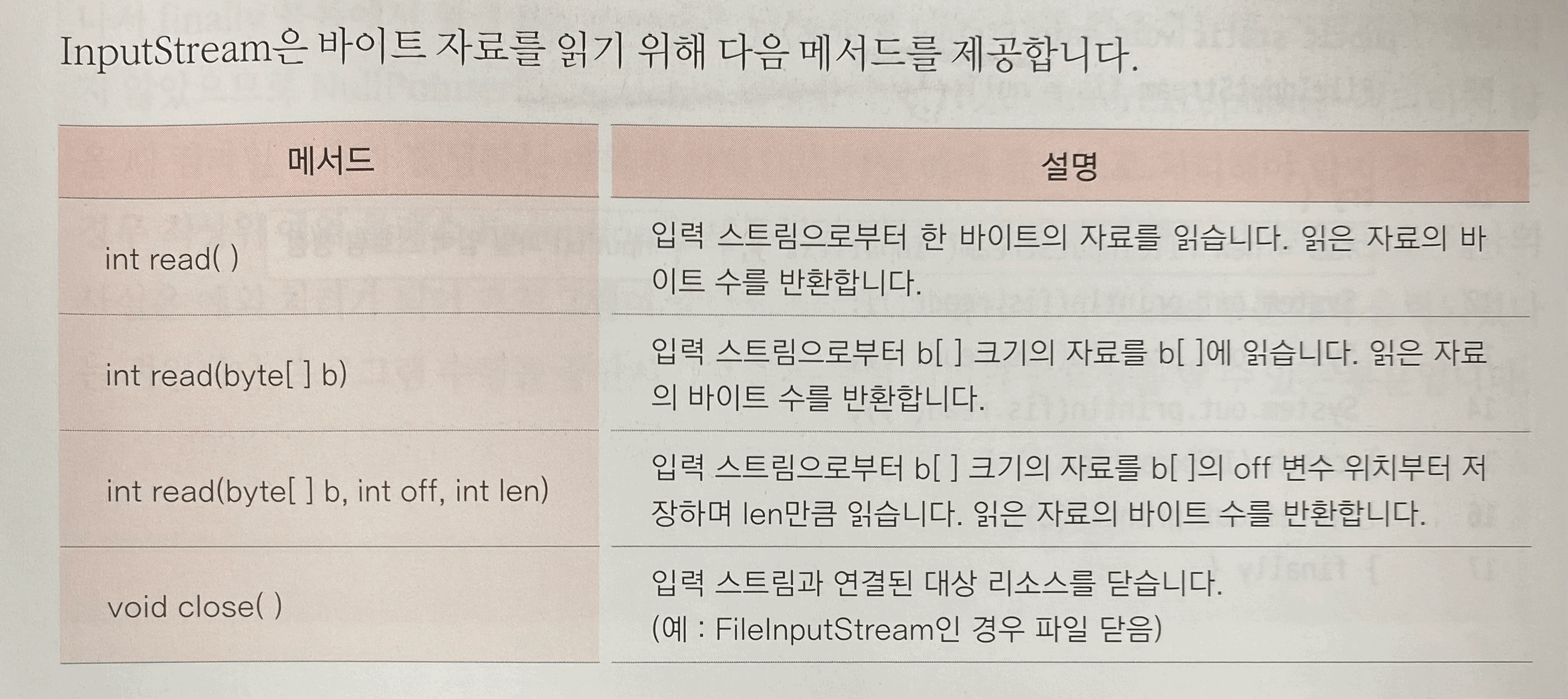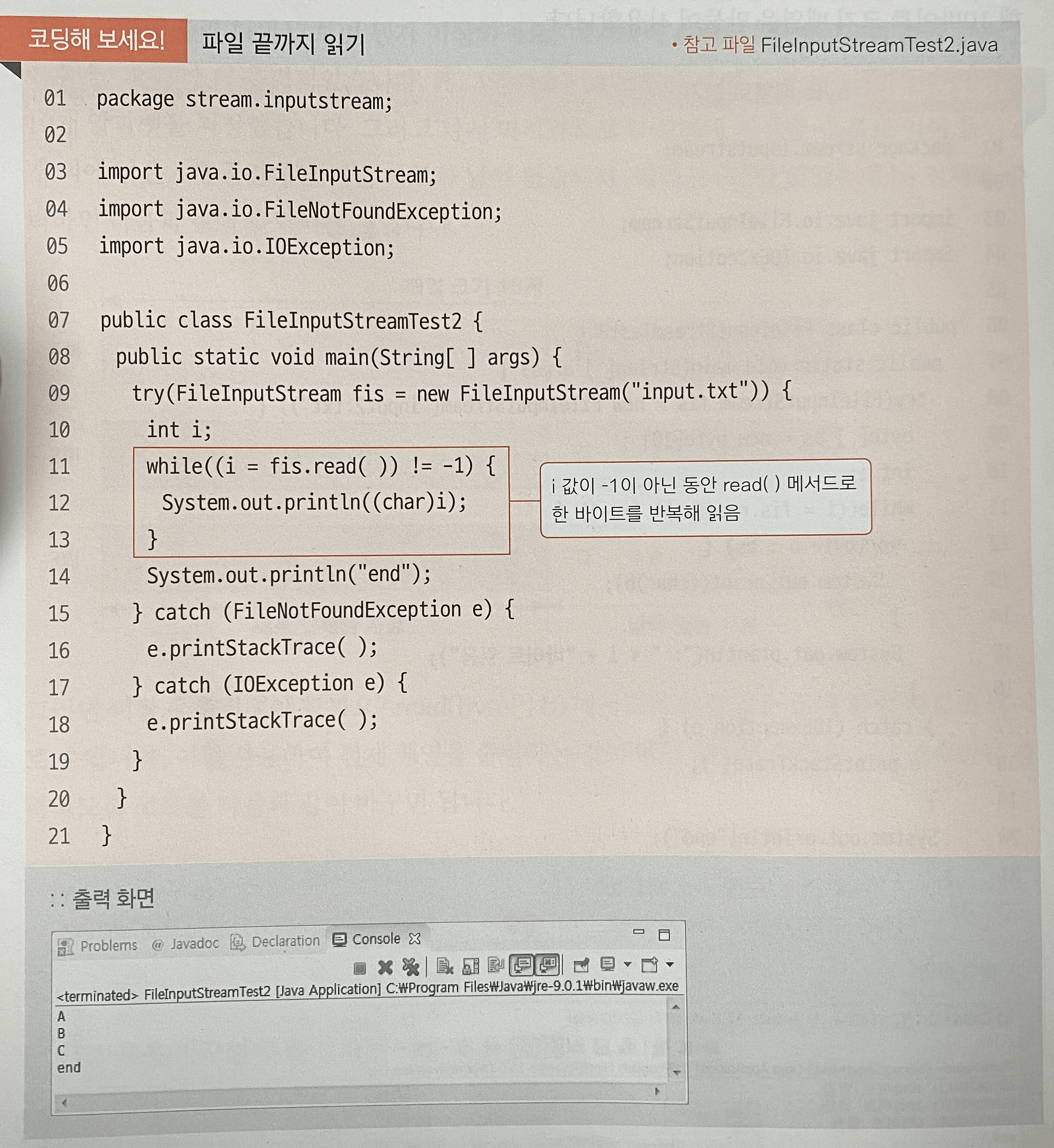 - i값이 -1이 아닌 동안 read( ) 메소드로 한 바이트를 반복해 읽음