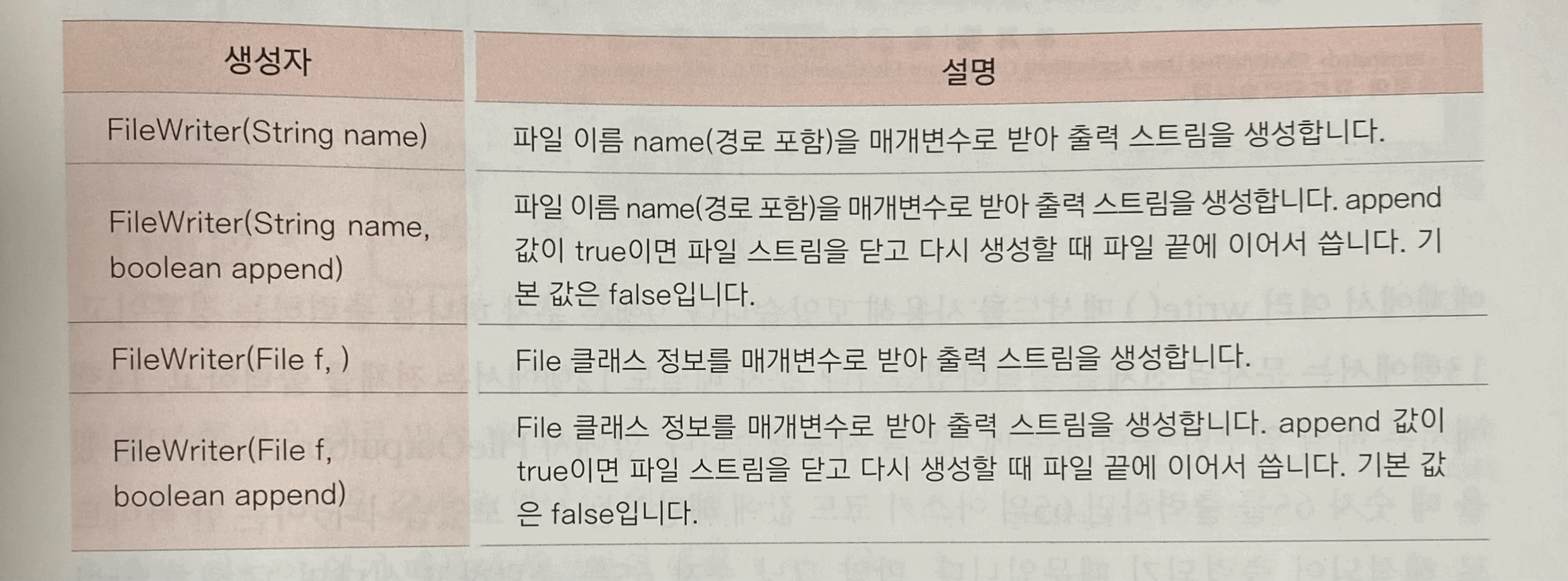 - FileOutputStream과 마찬가지로 출력 파일이 존재하지 않으면 파일을 생성