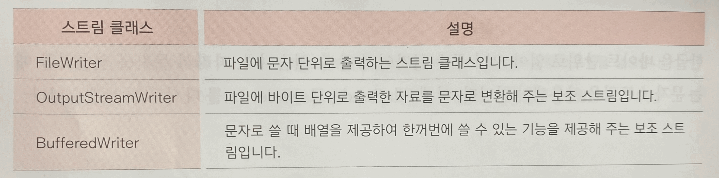 - FileOutputStream, FileWriter, BufferedOutputStream, BufferedWriter 등