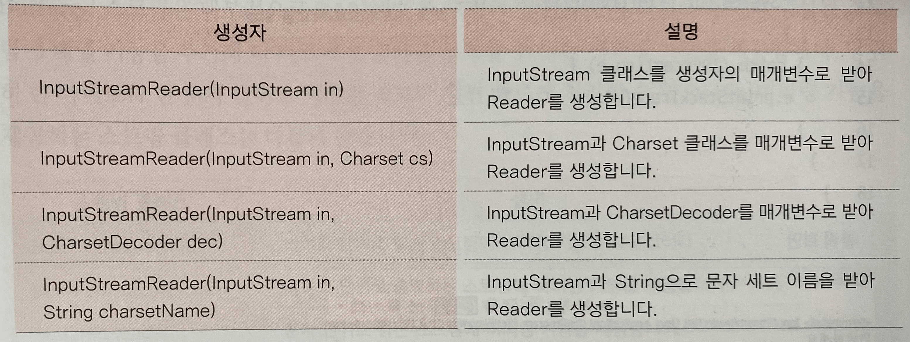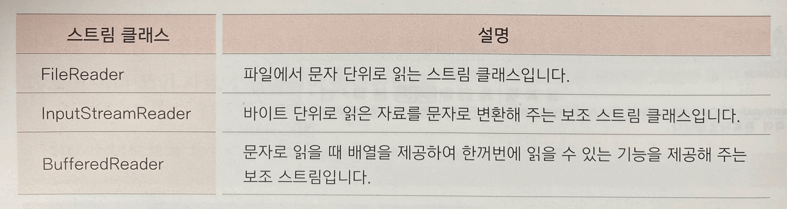- 바이트단위로 자료를 읽으면 한글 같은 문자는 깨짐, 따라서 Reader나 Writer에 상속받은 스트림을 사용해서 자료를 읽거나 써야함